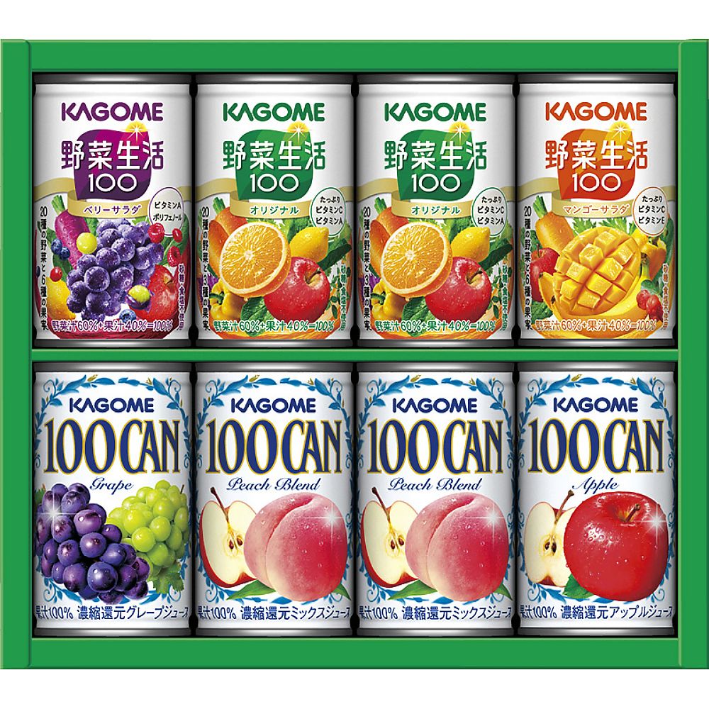 野菜&フルーツの美味しさが人気の「野菜生活100」と、100%フルーツジュースのベストセラー「KAGOME 100CAN」の詰合せ
