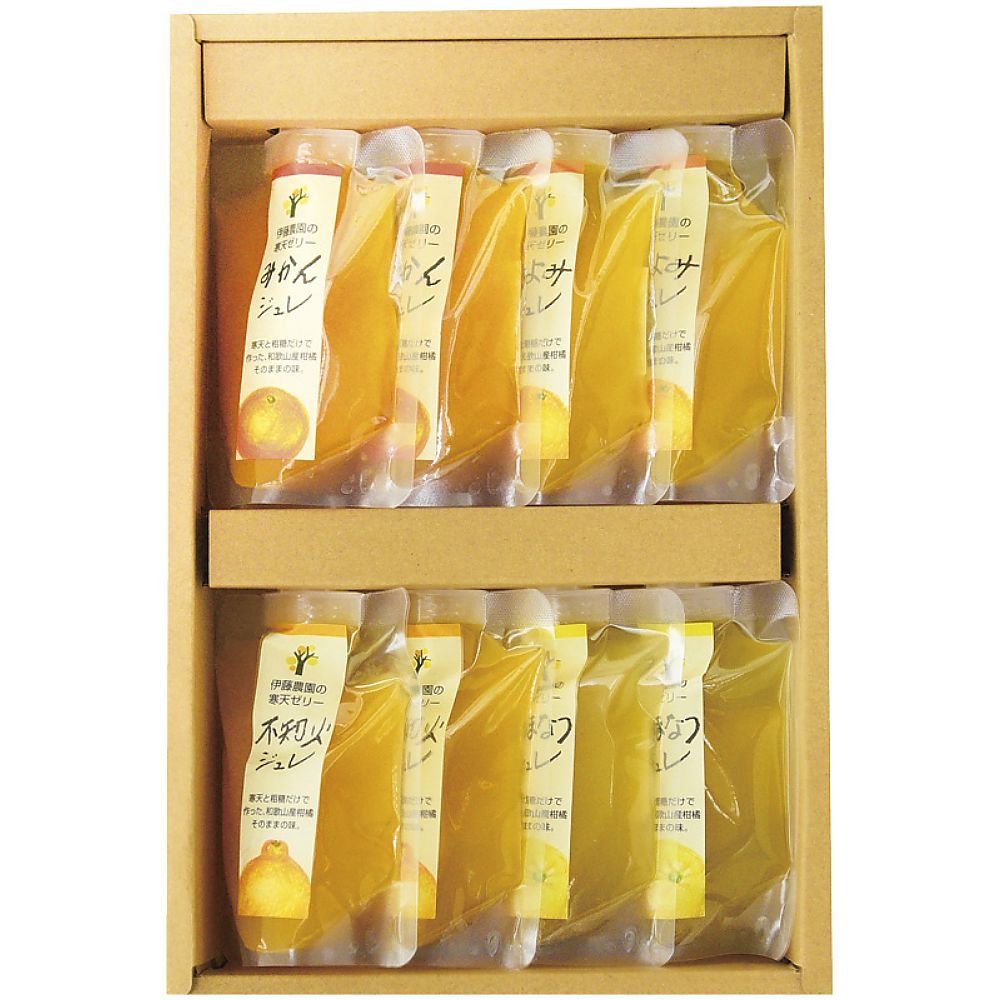 - 商品内容:セット内容/ピュアフルーツ寒天ジュレドリンクタイプ(みかん・きよみ・不知火・あまなつ)(各150g)×各2 箱サイズ/32.5×21.5×5.5cm 箱入重量/1.5kg 賞味期限/常温4ヶ月 備考/包装済
