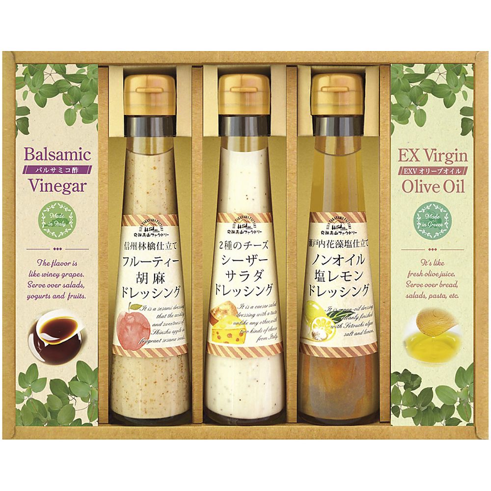 - 商品内容:セット内容/ドレッシング(信州林檎仕立てフルーティー胡麻・2種のイタリアンチーズシーザーサラダ)・瀬戸内花藻塩仕立てノンオイル塩レモンドレッシング(各120ml)・エクストラバージンオリーブオイル(8g×5p)・バルサミコ酢(3.3ml×5p)×各1 箱サイズ/22.5×29×5.5cm 箱入重量/1.2kg 賞味期限/常温6ヶ月 アレルゲン/卵・乳・小麦