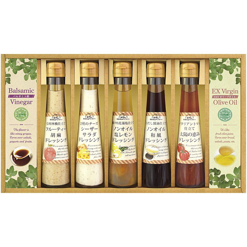 - 商品内容:セット内容/ドレッシング(信州林檎仕立てフルーティー胡麻・2種のイタリアンチーズシーザーサラダ・イタリアントマト仕立て太陽の恵み)・瀬戸内花藻塩仕立てノンオイル塩レモンドレッシング・白だし醤油仕立てノンオイル和風ドレッシング(各120ml)・エクストラバージンオリーブオイル(8g×5p)・バルサミコ酢(3.3ml×5p)×各1 箱サイズ/22.5×39×5.5cm 箱入重量/1.8kg 賞味期限/常温6ヶ月 アレルゲン/卵・乳・小麦