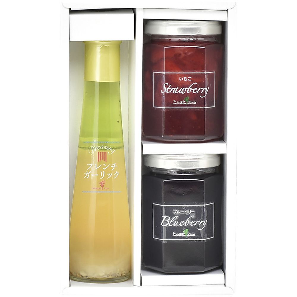- 商品内容:セット内容/ジャム(いちご・ブルーベリー)(各145g)・ドレッシング(フレンチガーリック)(122ml)×各1 箱サイズ/22×13×6.5cm 箱入重量/1.1kg 賞味期限/常温10ヶ月