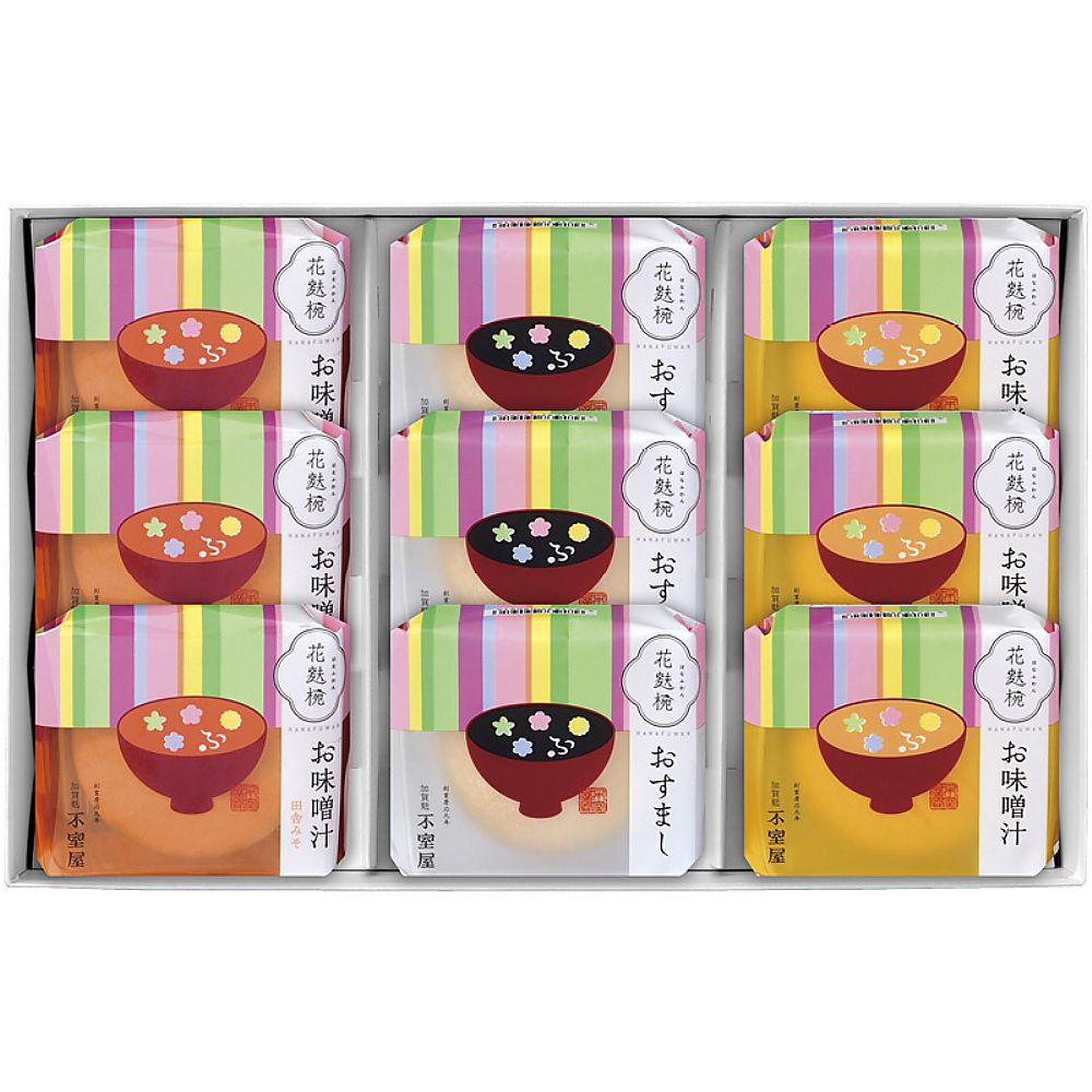 - 商品内容:セット内容/花麩椀(おすまし・お味噌汁・お味噌汁田舎みそ)×各3 箱サイズ/20×29.7×7.9cm 箱入重量/0.4kg 賞味期限/常温3ヶ月 アレルゲン/小麦