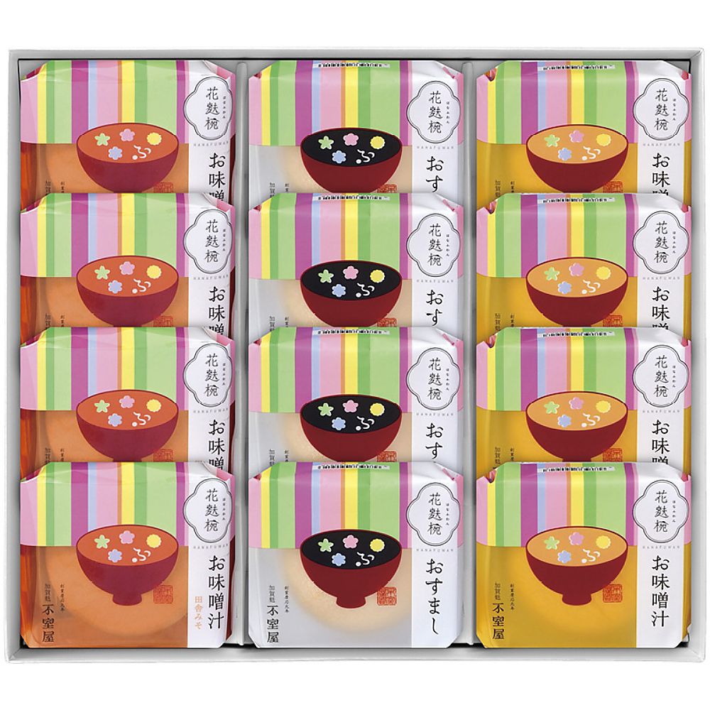 - 商品内容:セット内容/花麩椀(おすまし・お味噌汁・お味噌汁田舎みそ)×各4 箱サイズ/24×29.2×7.9cm 箱入重量/0.51kg 賞味期限/常温3ヶ月 アレルゲン/小麦