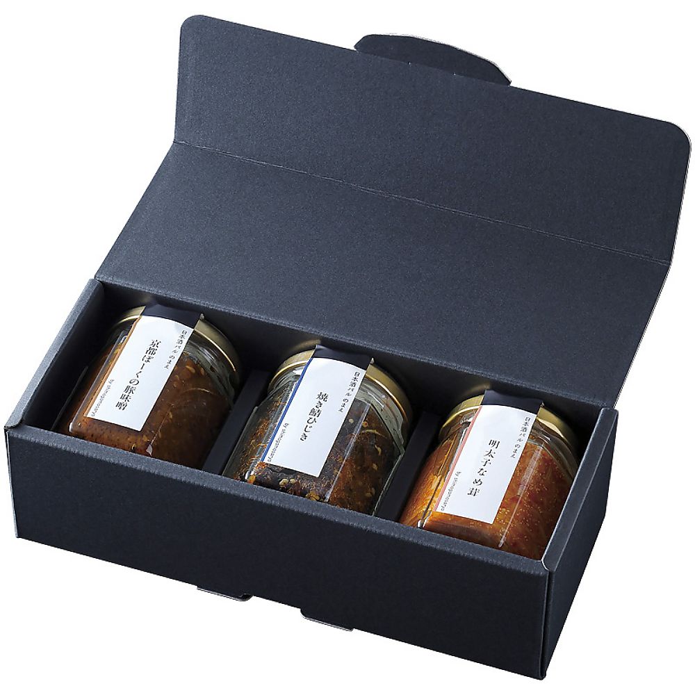- 商品内容:セット内容/京都ぽーくの豚味噌(110g)・明太子なめ茸(100g)・焼き鯖ひじき(55g)×各1 箱サイズ/8.1×25×6cm 箱入重量/1kg 賞味期限/常温6ヶ月 アレルゲン/小麦