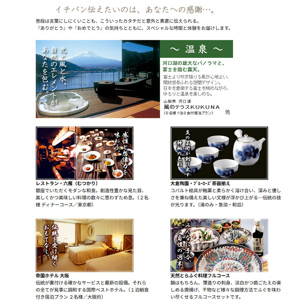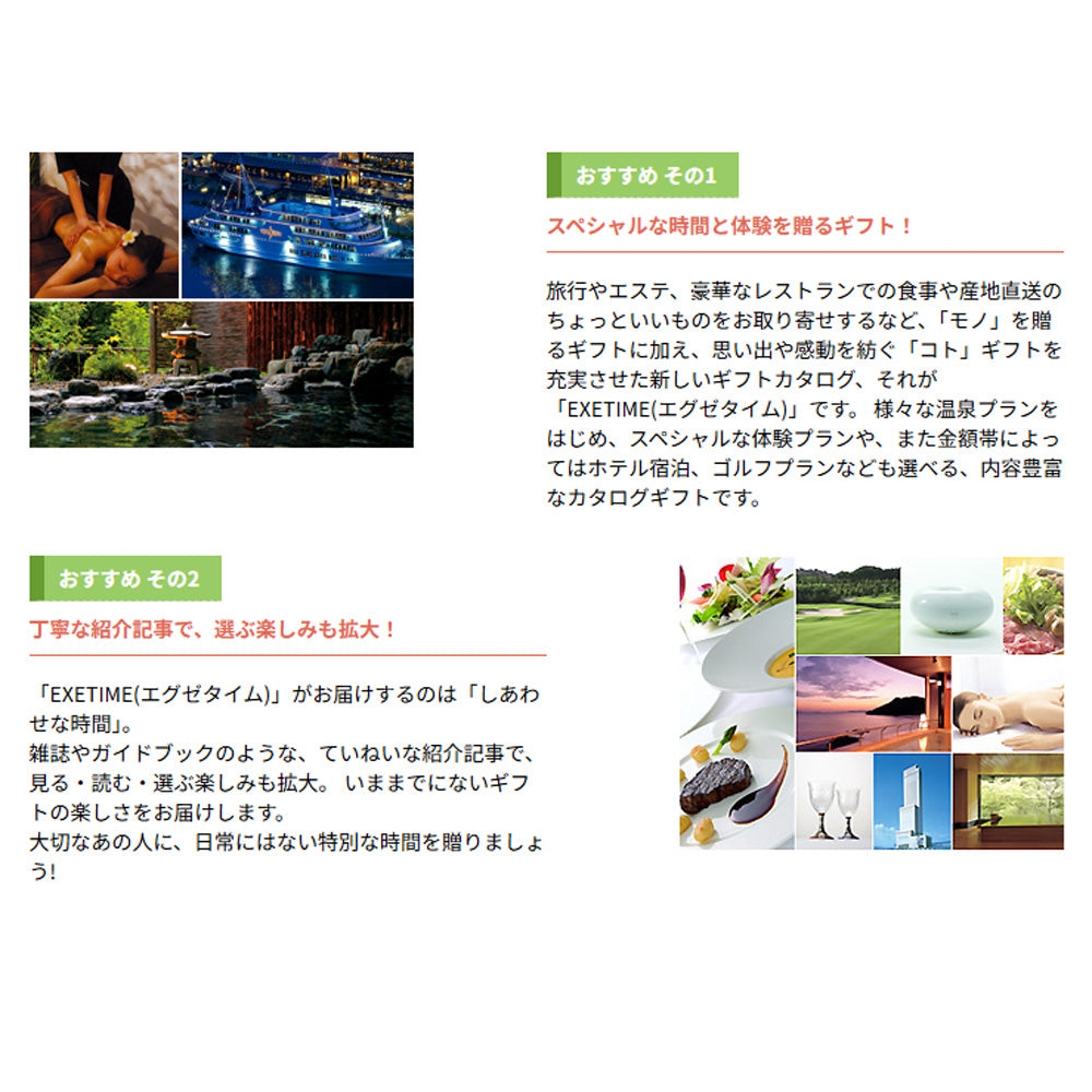 従来のカタログギフトの「モノ」コンテンツに加え、JTBセレクトによる温泉プランなど充実の「体験」コンテンツが嬉しい、新しい形のカタログギフトです。